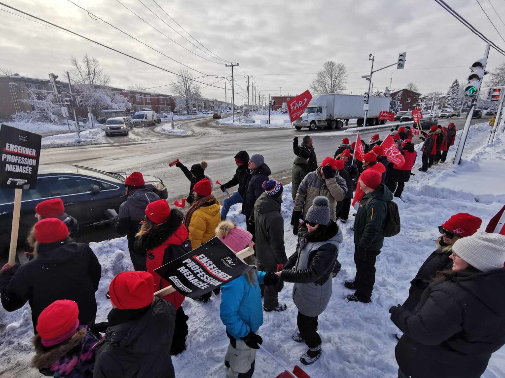Le 23 novembre dernier, les 66 500 profs de la FAE sont entrés en grève illimitée. Depuis le 24 novembre, nous formons des lignes de piquetage devant nos écoles afin qu’aucun travailleur n’entre dans l’établissement. C’est le principe même d’une ligne de piquetage.
