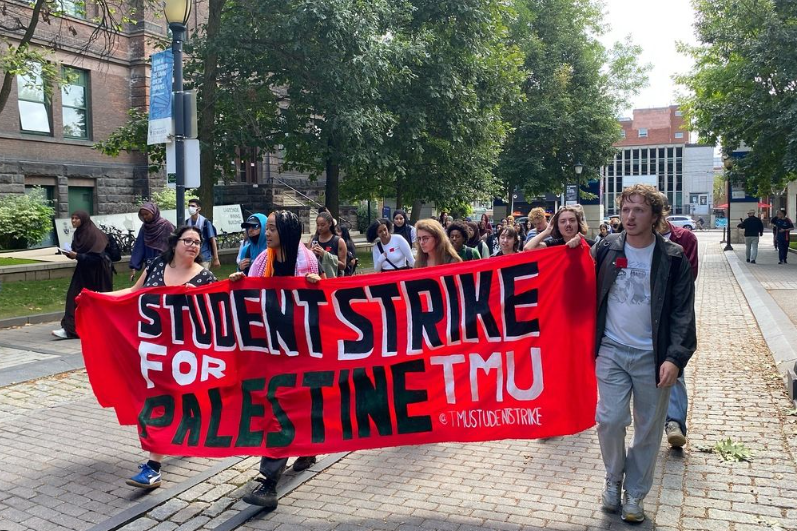 Un excellent exemple de mobilisation réussie vient de la Toronto Metropolitan University. Une petite poignée d’étudiants a organisé un débrayage de 150 à 200 étudiants le 6 septembre dernier. Dans une ambiance survoltée, la manifestation passait dans les corridors en invitant les étudiants à s’y joindre. Au moins deux enseignants pro-Palestine ont laissé leurs étudiants partir plus tôt pour rejoindre la mobilisation. Nous avons rejoint la manifestation organisée non loin de là à l’Université de Toronto.