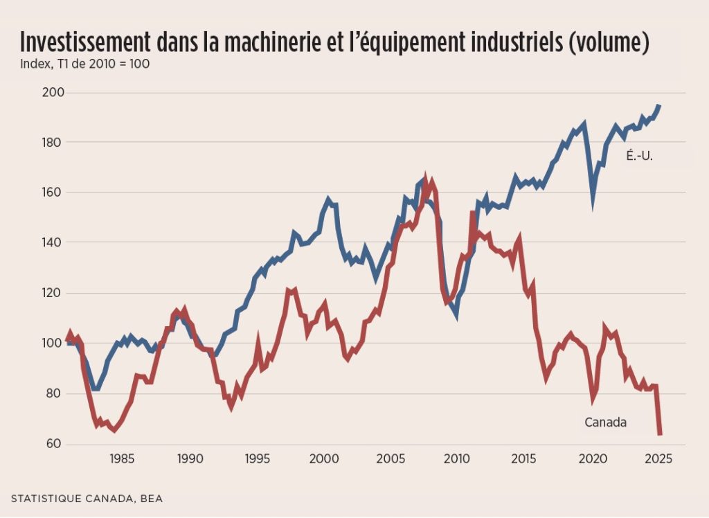 Le résultat, c’est ce que la Banque Nationale appelle une « implosion industrielle ». Tandis que les investissements dans les équipements et les machines industriels ont augmenté régulièrement aux États-Unis, ils ont chuté à leur plus bas niveau historique au Canada. Cela a entraîné une crise de la productivité du travail. Depuis 2022, la productivité du travail aux États-Unis a augmenté de 5,6%, tandis qu’elle a diminué de 1,2% au Canada. Les droits de douane ont accéléré ce processus, la productivité du travail ayant chuté de 1% au deuxième trimestre, alors que l’économie se contractait de 1,6%.