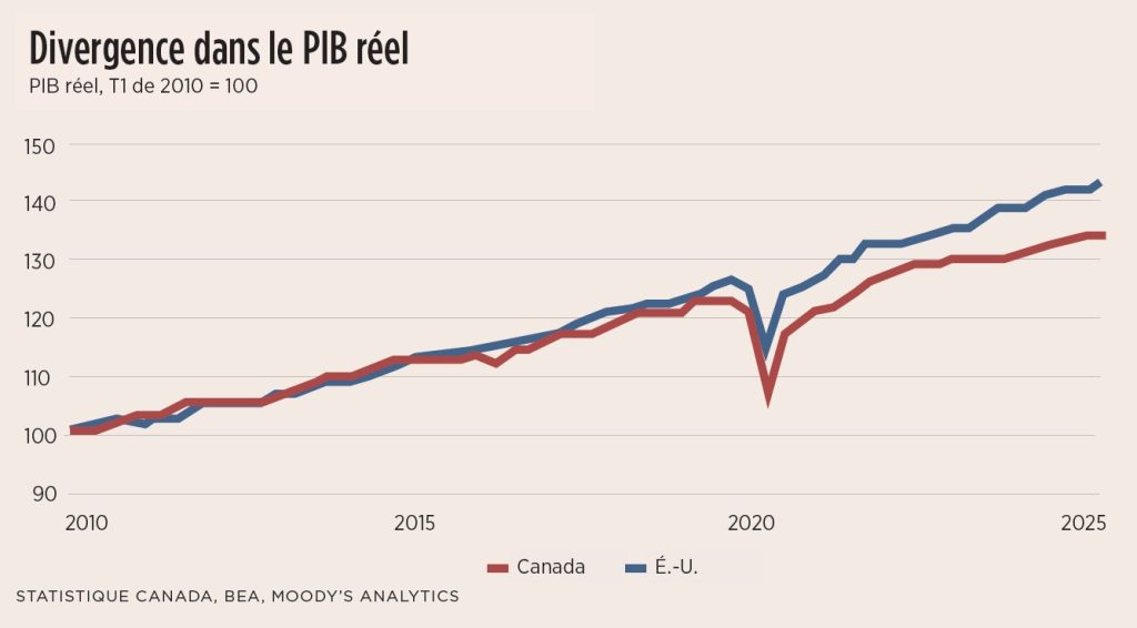 Et tandis que Trump accélère cette tendance, celle-ci existait bien avant. Comme le note ce rapport, le PIB canadien et américain grandissait plus ou moins au même rythme entre 2010 et 2017 (18 et 20% respectivement). Mais depuis 2022, les choses ont changé. Tandis que le PIB américain a crû de 6,7%, le Canada affiche un maigre 3,6%.