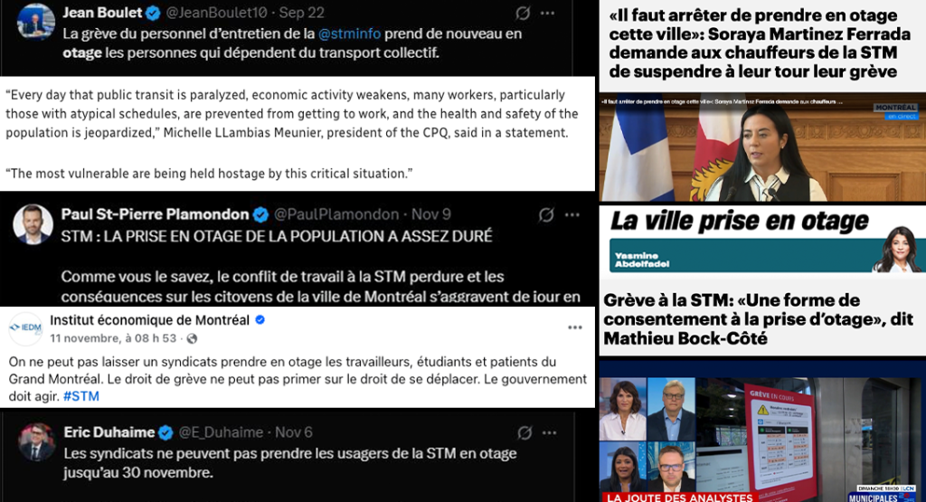 Les conseils patronaux, le ministre du Travail Jean Boulet, la nouvelle mairesse Soraya Martinez Ferrada, PSPP et Éric Duhaime se sont tous exprimés d’une seule voix : ils ont accusé les syndicats de « prendre en otage » la population. Tels des parangons de vertu, ils ont affirmé défendre les usagers et en particulier les plus vulnérables.