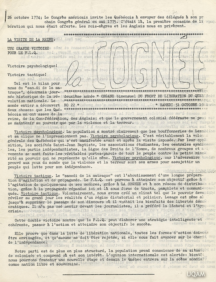 Cette différence entre le Mai français et la période des enlèvements marque précisément le lieu où s’inscrit la faiblesse de la stratégie felquiste. Compte tenu de la faiblesse de la conjoncture actuelle, le FLQ veut lutter pour les travailleurs, mais il ne peut absolument pas travailler avec eux pour les mobiliser et les organiser29. »