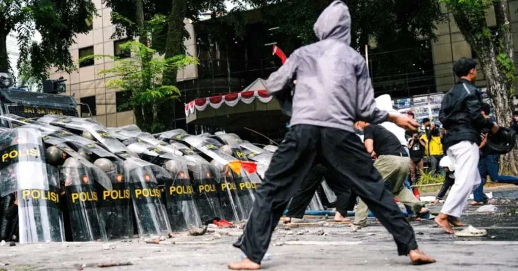 Le 25 août, des milliers de jeunes sont descendus dans les rues en Indonésie. Rassemblés devant le Parlement, ils ont résisté à des centaines de policiers armés de canons à eau, aux cris de « À bas le parlement! ». Des affrontements entre les jeunes et la police ont duré pendant une bonne partie de la nuit. Au matin, 400 personnes avaient été arrêtées, dont près de 200 lycéens.